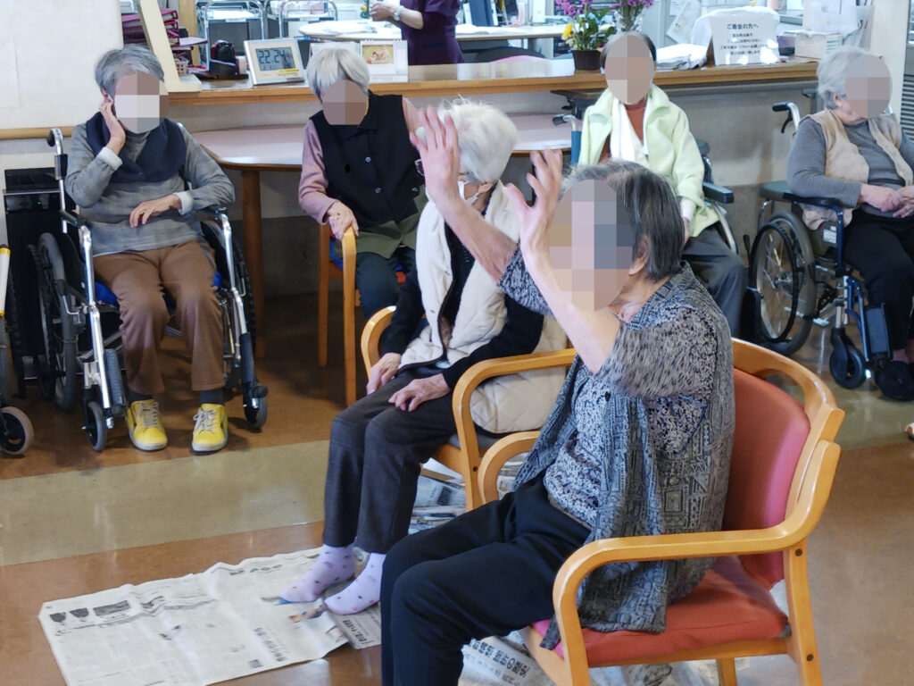 まずは定番。鬼に扮した職員めがけてみんなで豆(の代わりの紙玉)を投げます。普段の恨みは無いはずですが、ご入居の皆様、切れのある直球を投げ込んでいただきました。
